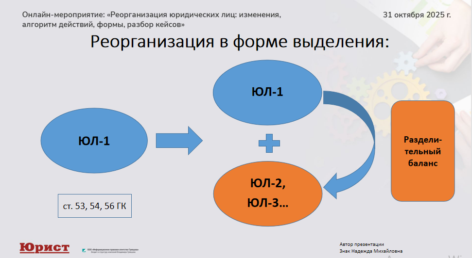 Абапіраючыся на шматгадовы досвед працы і практыку Borovtsov & Salei, увага эксперта сканцэнтравана на праблемных пытаннях і практычных складанасцях, якія ўзнікаюць пры ажыццяўленні рэарганізацыі юрыдычнай асобы ў форме вылучэння, у тым ліку,