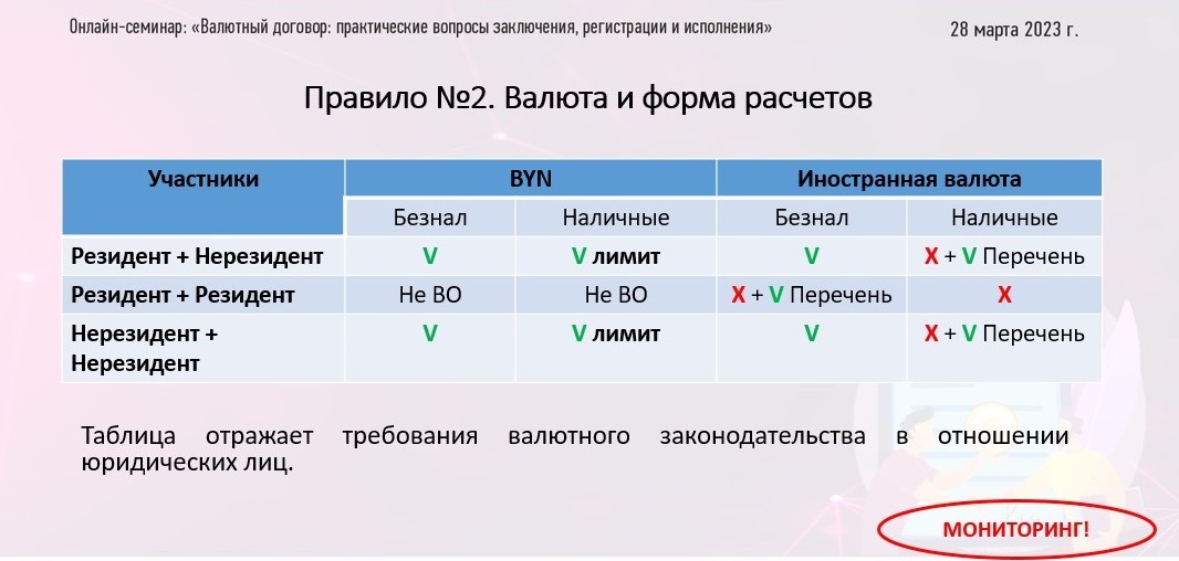 On March 28, 2023, partner Nadezhda Znak, as an expert, took part in an online seminar on the topic “Currency Agreement: practical issues of concluding, registration and execution”, organized by the Educational center “Professional interest”.