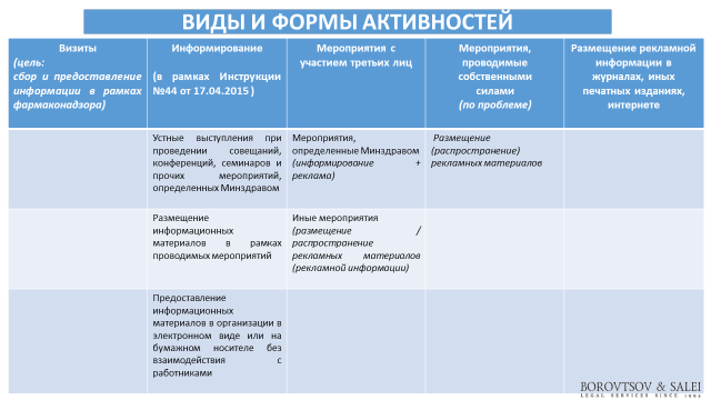 Borovtsov & Salei имеет значительный опыт работы в сфере правового сопровождения фарминдустрии и оказания правовой поддержки представительств формпроизводителей. Мы готовы быть полезными Вам!